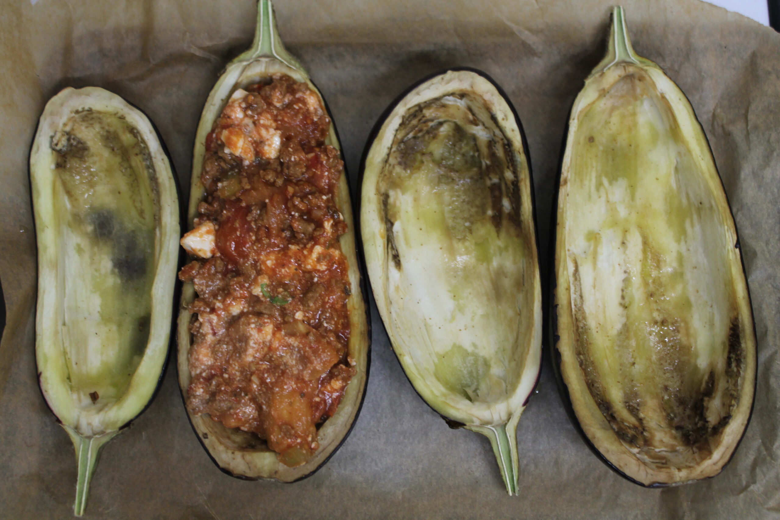 Para esta receita, usei a dita “carne picada”, que cozinhei num ragu de tomate e coloquei dentro de umas beringelas com queijo feta e manjericão. Uma espécie de “Italy meets Greece” nos sabores, simples, diferente, e que  pode perfeitamente ser feita com carne picada “verdadeira” (idealmente bovino) – deve ficar ainda mais saborosa, pois a gordura da carne enriquece bastante o molho de tomate.