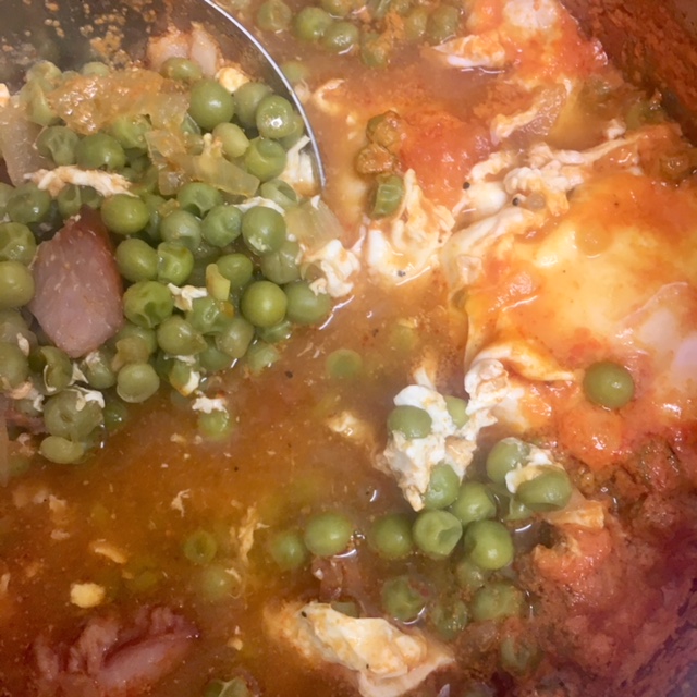 Por vezes, os primeiros dias de regresso, depois de estar em casa, são os piores. As saudades estão mais intensificadas pela presença, ainda recente, de tudo. Em dias como esses, como o de hoje, em que mais nada ajuda, um jantar com “sabor a casa” pode ser o melhor remédio. O de hoje, lembrado à pressão, é um clássico da minha avózinha. Há uns dias deparei-me com uma foto deste prato no feed de uma ex professora da Faculdade e, desde então, andava a salivar por ele. Das coisas mais simples desta vida, a receita dos ovos com ervilhas não requer grande ciência (ou tempo): apenas requer um refogado básico, umas ervilhas e uns ovos. Claro, um toucinho ou chouriço (à vontade do freguês) dá-lhe “o toque” final. Eu adicionei ainda um tomate maduro e um bocadinho de polpa, só para dar mais consistência. Et Voilá, sairam umas belas Ervilhas com Ovos escalfados, directamente para a minha mesa, para me animar a noite e fazer ganhar ânimo para acabar a semana! Não ficaram tão saborosas como as da avó, mas deu para matar a saudade!